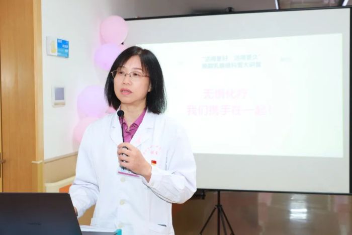 随后,乳腺科主任龙安莉为病友们带来了讲座《无惧化疗,我们携手在一起》,她告诉大家要坚持合理治疗、保持良好心态,通过医护患及其家属的共同努力,携手守卫生命的长度和生活的宽度。