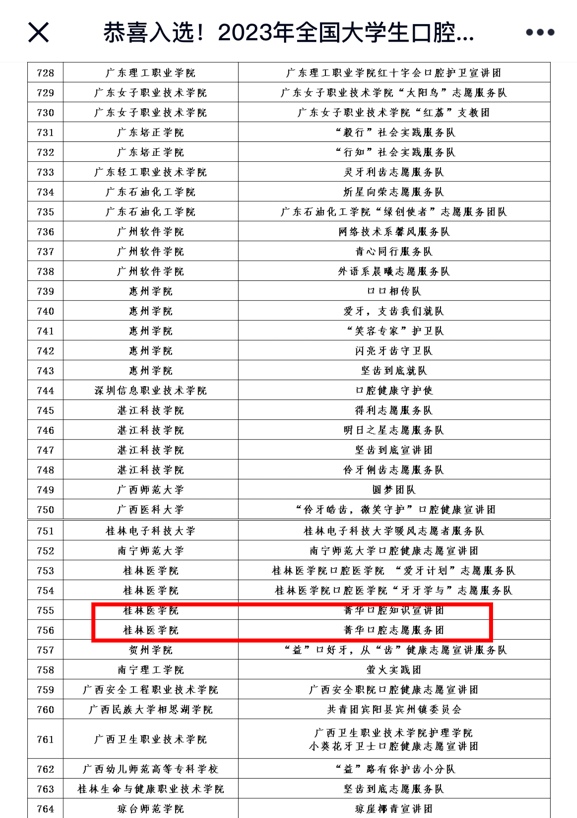 公告一经发出,全国范围内各高校志愿服务团队广泛关注并积极参与,最终主办单位评选出1000支大学生志愿服务团队。其中,桂林医学院第二附属医院口腔治疗中心、临桂临床医学院团委联合申报的两支队伍入选2023年全国大学生口腔健康志愿宣讲团,分别是菁华口腔宣讲团和菁华口腔志愿服务团。