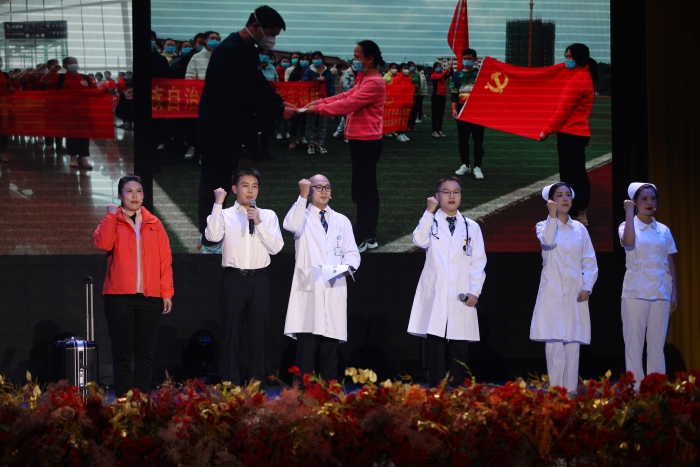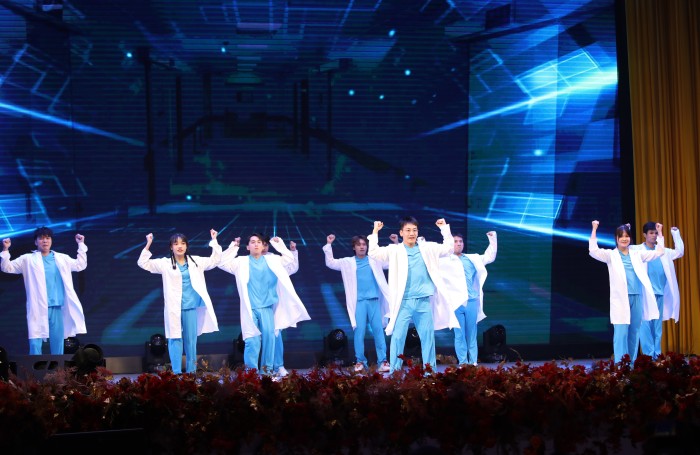 晚会由“传承”“守正”“向未来”三个篇章构成,每个篇章以情景剧为开头,展现不同时期南溪山医院的历史传承与使命担当。在传承篇章里,复原舞蹈《草原女战士》跳出三代南医人向上生命力,文场《咏南医》礼赞医院深厚文化底蕴,老职工的京剧表演和诗朗诵,传递着在京职工浓浓南医情;在守正篇章里,医联体成员单位精心准备的5个节目,讲述着党旗引领下南溪山医院与基层医疗机构携手前进的感人故事;在向未来篇章里,舞蹈《手术室之夜》燃爆全场,创新展现桂北首台达芬奇手术机器人落户南医,引领医疗科技高质量发展,歌舞《有我》表达出新生代医者对医务工作的热爱。