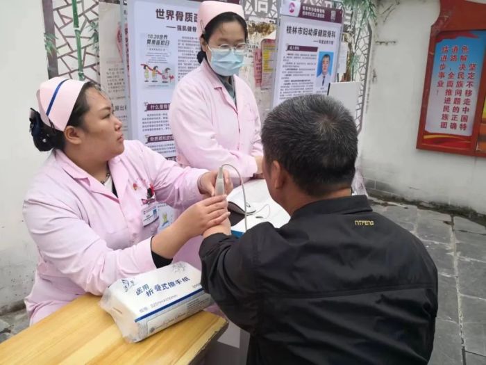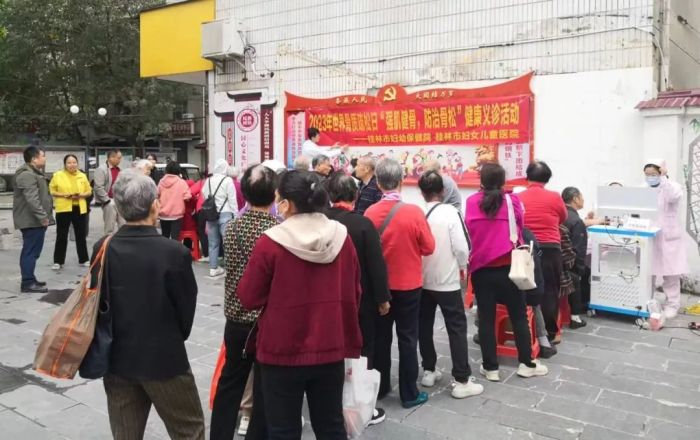 义诊活动现场气氛热烈,桂林市妇幼保健院骨科、内分泌科、中医科、耳鼻喉科、呼吸与危重症医学科等10余名医护专家和党员志愿者组成的医疗服务队通过现场咨询、知识宣教等形式开展骨质疏松知识宣教。义诊现场还为公众提供免费超声骨密度检测、免费测血压、免费肺功能监测等服务。骨科专家对患者进行骨质疏松筛查与专业评估,对筛查出的高危人群进行诊治及日常保健指导,引导他们在日常生活中通过科学补钙、合理膳食、适宜运动等实用的方式预防骨质疏松,提高骨骼健康水平。现场,多学科专家们一边为群众答疑解惑,一边宣传普及骨科骨质疏松预防治疗、糖尿病等预防保健知识以及中医康复、流感等疾病预防保健知识等,并指导群众如何合理用药、营养运动等。