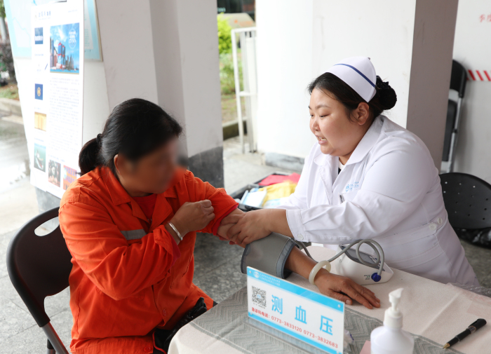 南溪山医院国际健康管理中心护士长谭静为职工测量血压