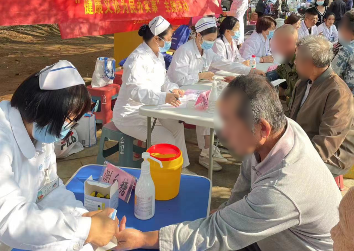 肾病内科护士长吴金燕、血液内科护士长张健坤、曾妮妮等为村民测血糖、量血压