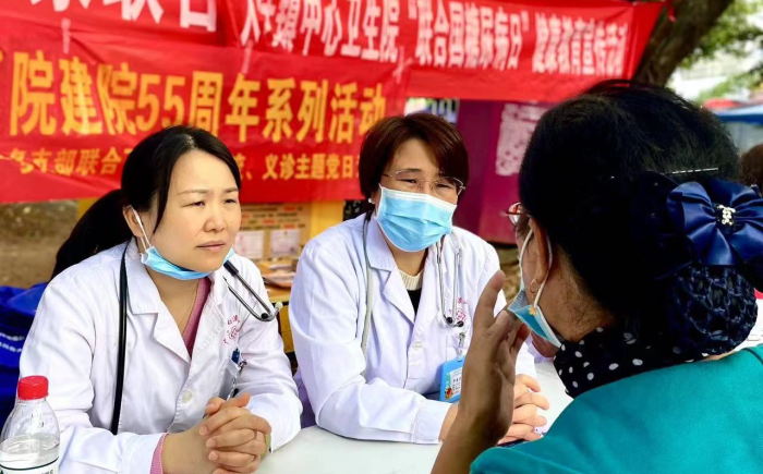 内科第七党支部书记王薇、血液内科主任罗泉芳为村民义诊