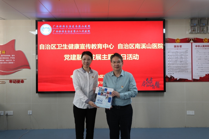南溪山医院党委书记柳宏林向自治区卫生健康宣教中心赠送了医院丛书,并详细介绍了医院党建、宣传等工作的基本情况。他希望南溪山医院与宣教中心在媒体深度融合的发展背景下,扩大宣传及健康科普工作的传播力、引导力及公信力,探索并实践传播新形式,不断向外界展示广西卫生健康系统良好形象,讲好南医故事。(通讯员 李金戈)