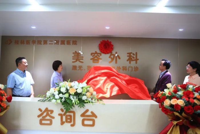 为满足多元化、个性化的医疗美容需求,为爱美人士提供更专业、更规范、更便捷的服务平台,11月7日,桂林医学院第二附属医院美容外科全新整装升级,当天在门诊楼六楼为整装升级的美容外科举行揭牌仪式。医院党委副书记、院长莫碧文,副院长王海鹏、刘颖,受邀嘉宾及相关科室负责人参加仪式。