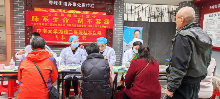 11月15日是第22个“世界慢阻肺日”,为了提高公众对慢阻肺的认知,中南大学湘雅二医院桂林医院呼吸与危重症医学科联合秀峰社区卫生服务中心在百梓社区开展了一场以“肺系生命 刻不容缓”为主题的慢阻肺日宣传活动。本次活动旨在强调早期肺部健康、早期诊断和早期干预的重要性,帮助居民提高对慢阻肺的认识,改善慢阻肺诊断不足和治疗不力的现状。