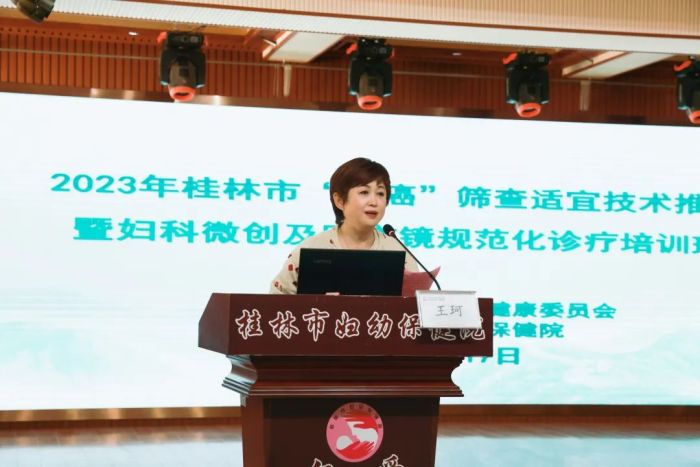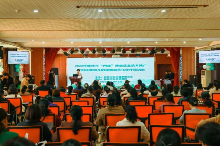 为进一步规范我市妇女宫颈癌和乳腺癌(以下简称“两癌”)筛查项目实施,促进相关适宜技术的推广使用,扩大“两癌”筛查的覆盖面,提高“两癌”的早诊早治率,11月17日至18日,由桂林市卫生健康委主办、桂林市妇幼保健院承办的2023年桂林市“两癌”筛查适宜技术推广暨妇科微创及阴道镜规范化诊疗培训班顺利举行。全市各县(市、区)卫健局、妇幼保健机构分管领导、“两癌”筛查项目负责人及相关科室业务管理人员,各级医疗机构相关医务人员共计200余人参加培训。市妇幼保健院副院长王珂出席开班仪式,市妇幼保健院妇女保健部部长刘勋姣主持仪式。