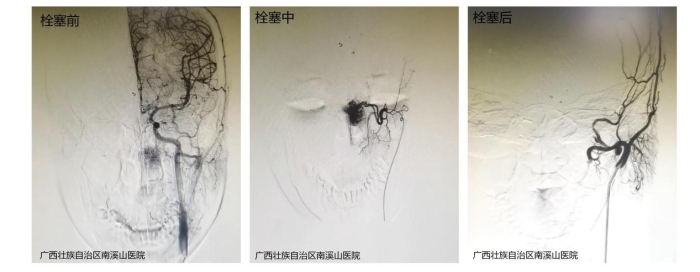 小廖确诊后,南溪山医院的医护团队快速为其制定了全面的治疗方案。首先由介入治疗科副主任蒋洪春为小廖进行了数字减影血管造影(DSA)以及上颌动脉及咽升动脉栓塞术,通过导管介入的方法,阻断瘤体责任血管的供血以达到减少术中出血的目的。蒋洪春凭借多年的临床经验和高超的技术,成功完成了这一关键步骤,为接下来的手术奠定了基础。