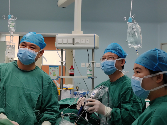 随后,耳鼻咽喉头颈外科主任医师黄金忠和副主任医师孔令平默契配合,在麻醉科主任医师陆永红的帮助下成功为小廖进行了鼻内镜下鼻咽纤维血管瘤切除手术。