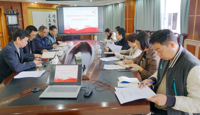 11月22日,桂林市卫健委党组副书记、副主任刘斌,副主任麦浩带队到桂林市中医医院就药品耗材采购、设备采购等重点工作进行调研指导。医院院长谭永星、纪委书记黄泽旗、副院长唐刚健、副院长邓建华及相关科室负责人参加了座谈会。