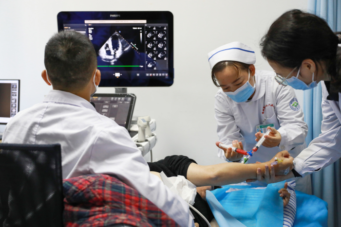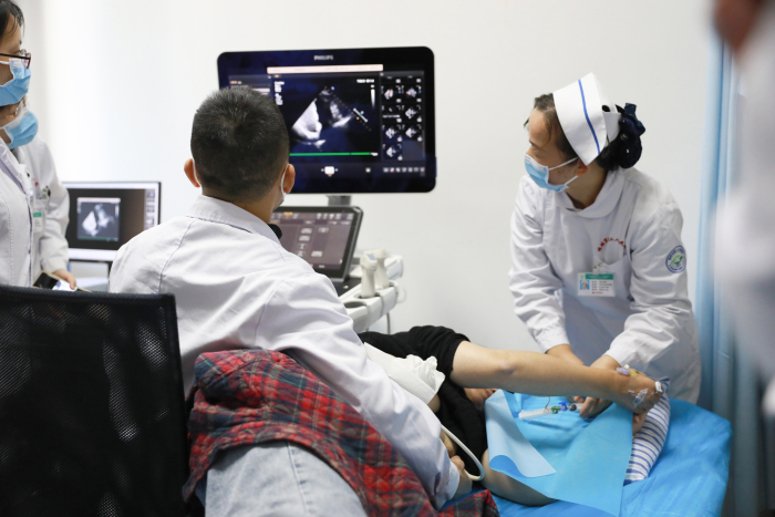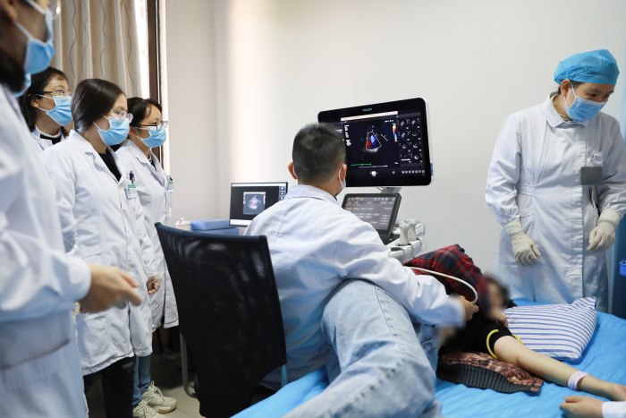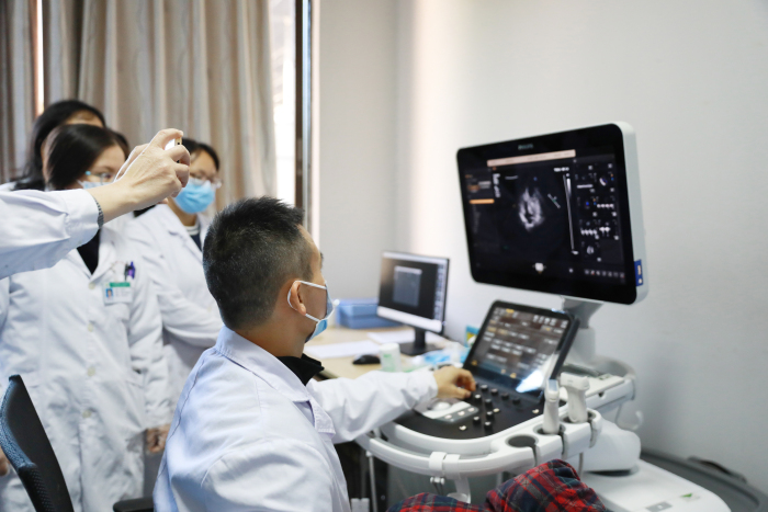 患者入院后,神经内科团队积极为其查找病因,经颅多普勒发泡试验初筛检查结果显示,不排除卵圆孔未闭可能。湘雅二医院驻桂专家申向民教授联合超声医学科驻桂专家唐逵教授分析病情后,建议患者行经胸超声心动图右心声学造影检查以进一步明确诊断。经患者同意,11月21日上午,唐逵教授与神经内科护士长谭永梅等共同为患者开展此项新技术。