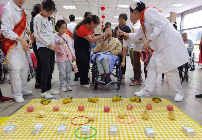 活动在医务人员合唱《九月九的酒》、《听我说谢谢你》拉开序幕。游园活动设置了投壶、水果套圈、听口令做动作、吹乒乓球、轮椅驱动等项目,融合了下肢运动、手功能活动、认知理解、心肺功能等康复训练内容,形式灵活多样,内容丰富多彩,实现康复训练寓教于乐的目的。康友们根据自己的喜好,在游园活动中挑战自己,收获奖品,阵阵欢笑声把活动推向了高潮。