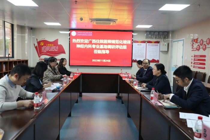 为加强住培基地内涵建设,11月24日上午,受自治区卫生健康委科技教育处委托,广西住培工作指导委员会神经内科调研评估专家组组长、广西科技大学第一附属医院副院长黄进瑜一行5人到广西壮族自治区南溪山医院开展2023年全区住院医师规范化培训神经内科专业基地督导工作。南溪山医院副院长唐芬、教学管理科副科长刘中伟和医院神经内科专业基地管理人员、指导医师代表等参加汇报会。