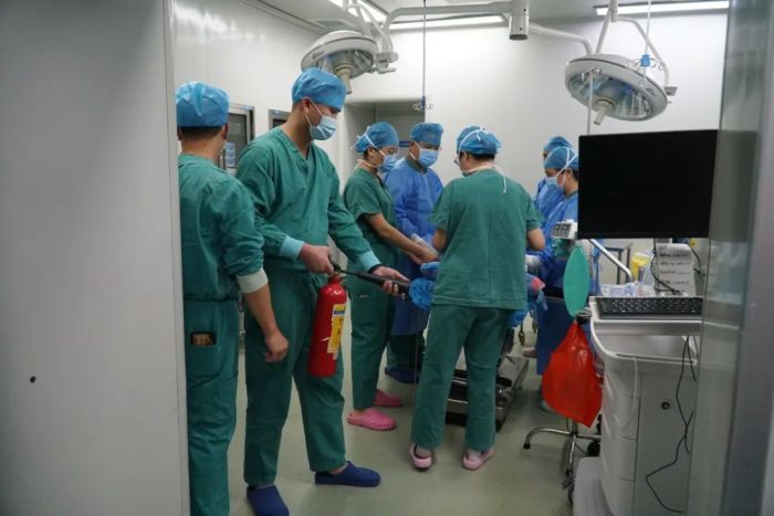 “起火了,赶快灭火!”演练以手术室第2间突然发生火情为背景,巡回护士发现火情立即呼叫告知在场人员,护士长立即报告保卫科及上级领导,同时启动应急预案,关闭电源,关闭氧气,使用灭火器进行灭火,手术医生停止手术,封闭伤口,即刻将患者从消防通道转运至安全场所。最后在保卫科人员的努力下火势得到控制,负责人员清点人数及损失情况记录并上报及做好患者的安抚工作。