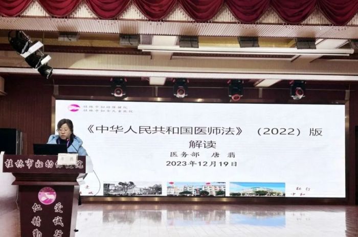 为了进一步加强医务人员依法执业管理,强化医务人员法律意识,规范执业行为,提高医疗工作质量,12月19日下午,桂林市妇幼保健院组织开展普法专题培训,医务部副主任(主持工作)兼科教科科长唐翡对新修订的《中华人民共和国医师法》进行解读。医院临床、医技科室医务人员共180余人参加。