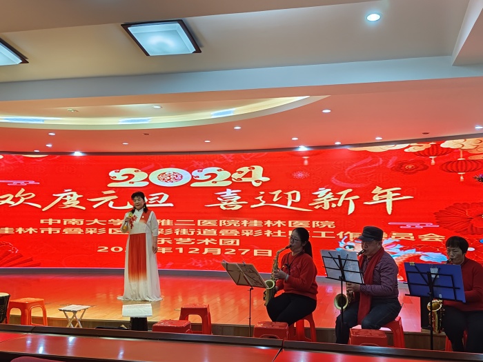 为进一步丰富离退休职工的生活,中南大学湘雅二医院桂林医院离退休办公室联合叠彩社区工作委员会及彩乐艺术团,于12月27日上午,在中南大学湘雅二医院桂林医院礼堂举办了一场别开生面的“欢度元旦 喜迎新年”文艺演出。