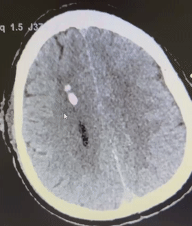 据了解,这名71岁高龄的老伯,因高血压小脑出血被急诊收治入住中南大学湘雅二医院桂林医院神经外科监护病区。当天7时左右,老伯突然出现意识障碍加深、神志昏迷的症状,且GCS(格拉斯哥昏迷指数评分,是一种评估昏迷患者的诊断指标,满分15分)评分仅为7分。急诊医生立刻复查患者头部CT,结果提示患者小脑出血且水肿加重、四脑室受压变形、幕上梗阻性脑积水并脑疝危象。