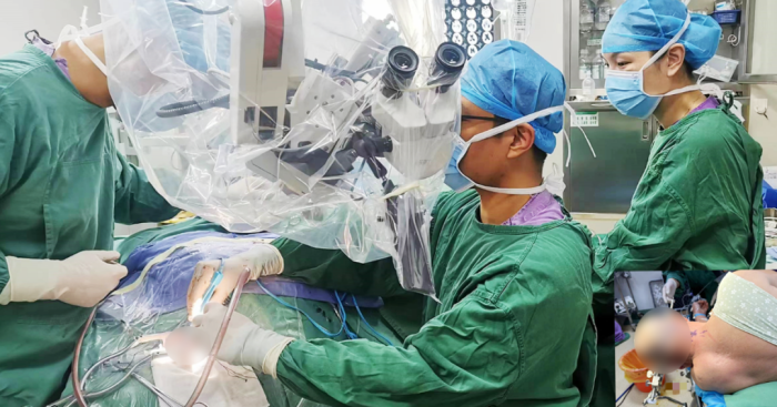 为尽快缓解患者梗阻性脑积水并颅内压增高脑疝危象情况,待麻醉平稳后,神经外科团队为患者先进行了脑室外引流(EVD),逐步释放脑脊液,梯度降低颅内压后再改侧俯“公园椅卧位”,进行显微镜下后颅窝小脑血肿清除。血肿清除后,医生在显微镜下发现患者右侧小脑海绵状血管畸形,与血肿来源位置一致,于是一并切除病变。手术顺利结束,患者术后意识障碍恢复,GCS评分达到14分,目前正在积极护理与康复中。