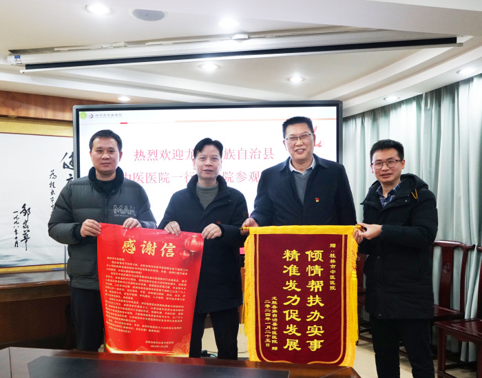 1月25日,龙胜各族自治县中医医院党支部书记蒋茂华、院长彭伟一行到桂林市中医医院就对口帮扶工作进行交流。医院领导班子、相关科室负责人参加座谈会。