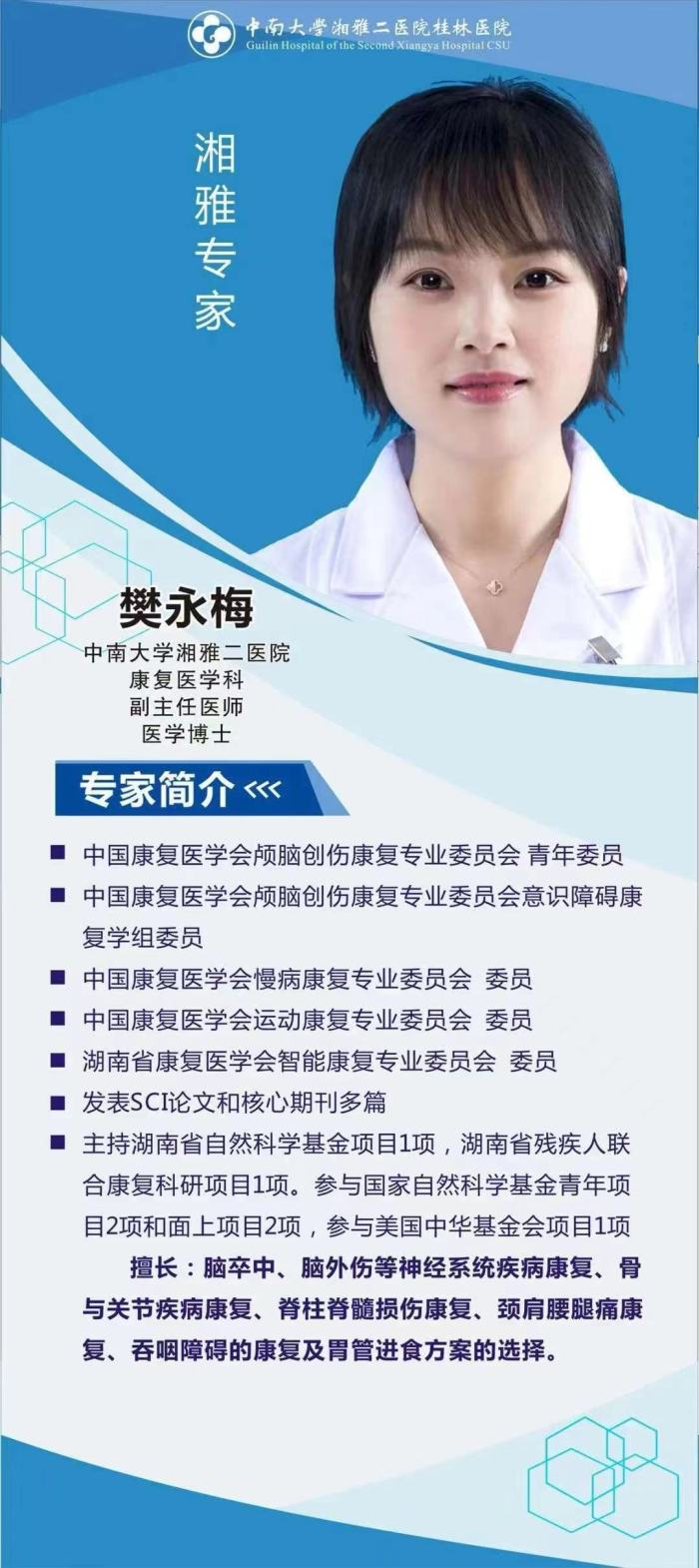 中南大学湘雅二医院桂林医院康复医学科与广西壮族自治区江滨医院、广西医科大学第一附属医院、广西壮族自治区人民医院、广西中医药大学第一附属医院康复医学科结为康复联盟,是集治疗、康复、预防、保健于一体的综合临床学科。科室拥有业务用房面积约800平方米,分设康复评定室、运动治疗室、作业治疗室、言语治疗室、理疗室、中医传统针灸、推拿治疗室等,并设置独立门诊和康复病房。