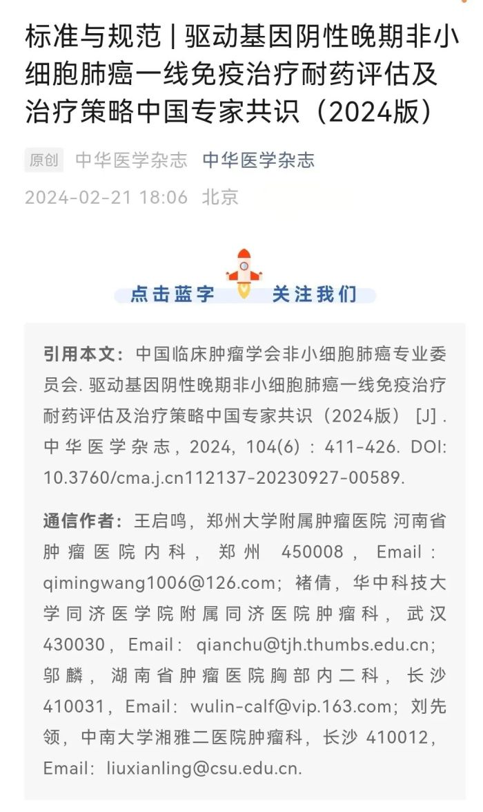 日前,国内知名临床肿瘤专家,湘雅二医院桂林医院刘先领教授作为发起专家、通信作者之一的《驱动基因阴性晚期非小细胞肺癌一线免疫治疗耐药评估及治疗策略中国专家共识(2024版)》在《中华医学杂志》正式发表。该共识的制定,为我国非小细胞肺癌免疫治疗临床实践提供了宝贵的指导建议。