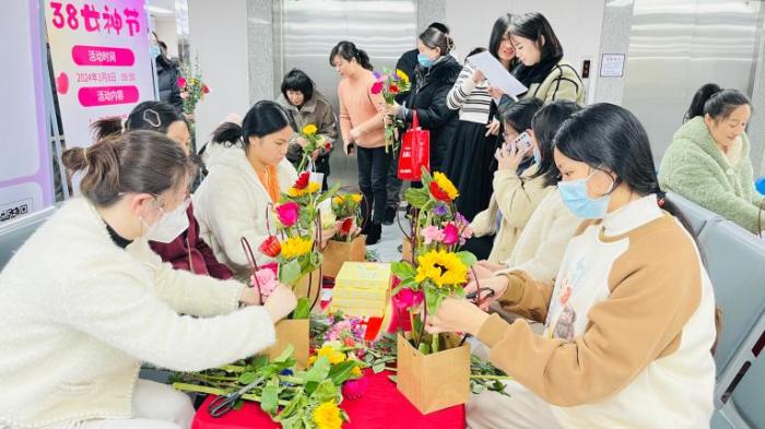 本次活动还安排了插花制作环节。活动现场,孕期保健科工作人员为大家分发材料,进行简单讲解之后,孕妈妈们便开始了自己的创作。修枝剪叶、搭配色彩,然后细致地置入手提花篮,经过她们的巧手,一个个色彩鲜艳、造型各异的作品展现出来,每朵花里都根植着对生活的美好向往。
