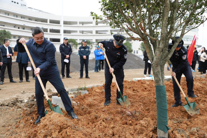 在植树活动开始前,桂林市公安局临桂分局庙岭派出所所长邓明明为活动致辞。他表示很高兴与医院共建“绿色家园”,全体警务工作人员是守护平安的使者,要以实际行动带动全社会形成“共建、共治、共享”的社会治理格局,将不遗余力为中南大学湘雅二医院桂林医院(国家区域医疗中心)的全面运行保驾护航,让广大人民群众生活更美好、社会更繁荣稳定。
