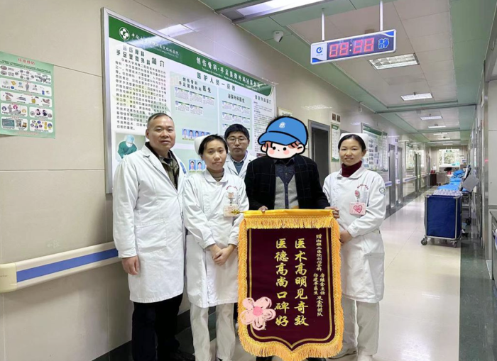 在医务人员的悉心照护下,陈女士顺利出院。出院当天,陈女士的家属特地向医护人员送上一面锦旗,感谢唐继全主任的高超医术及住院期间医护人员的精心照护。