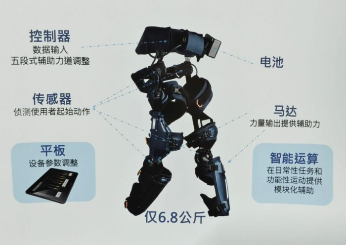 可穿戴式下肢外骨骼机器人是由可穿戴式下肢外骨骼和平板组成,透过行动感测器感应髋关节与膝盖角度的变化,利用人工智能算法技术带动伺服马达输出精准的动力,辅助使用者完成行动。通过训练可以逐步矫正使用者的步态,增强下肢步行能力,恢复行走功能。