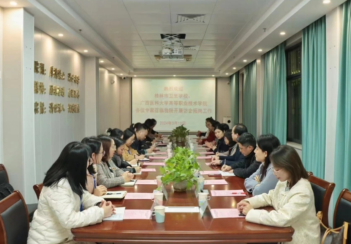 近日,广西医科大学高等职业技术学院、桂林市卫生学校一行12人到桂林市中西医结合医院开展访企拓岗工作交流活动。本次活动在行政楼111会议室开展,副院长靳清主持,医院相关职能部门负责人及临床带教科室护士长参加。