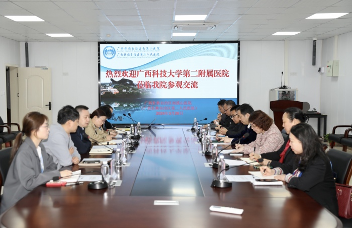 为加强双方医院间的合作与交流,探讨医疗质量管理及医院等级评审工作,提升医疗服务水平,3月26日,广西科技大学第二附属医院党委书记谭铁军,党委副书记、院长覃莲,副院长韦富贵带领部分职能科室负责人到广西壮族自治区南溪山医院座谈交流。南溪山医院党委副书记、院长李朝旭,副院长唐芬与相关职能科室负责人出席座谈会。