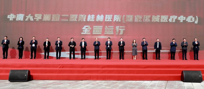自治区政府副主席廖品琥、桂林市市长李楚、中南大学副校长陈立章、中南大学原常务副书记陶立坚、桂林市委副书记卢新华、自治区发改委副主任罗陈娟、自治区科技厅副厅长李克纯、自治区人力资源和社会保障厅副厅长袁国华、自治区财政厅二级巡视员黄国希、自治区卫生健康委二级巡视员吴才林、自治区医保局副局长徐广保、湘雅二医院院长吕奔、桂林市人大常委会副主任谢灵忠、桂林市副市长郑平、桂林市政协副主席郑毅、桂林市政府秘书长李一飞,在桂医疗单位负责人、湘雅二医院桂林医院领导班子和职工代表共计300余人参加此次全面运行仪式。