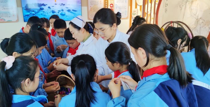 “同学们,把这几味中药粉装进小内袋里,再放入香囊外袋中,一个扶正祛邪提神醒脑的香包就制作好了……”在中药香包制作体验及佩戴中,经过医务人员的悉心指导,同学们都亲手制作或者佩戴了中药香包。