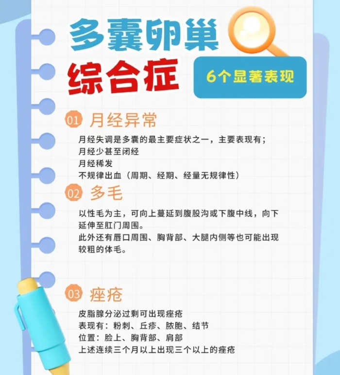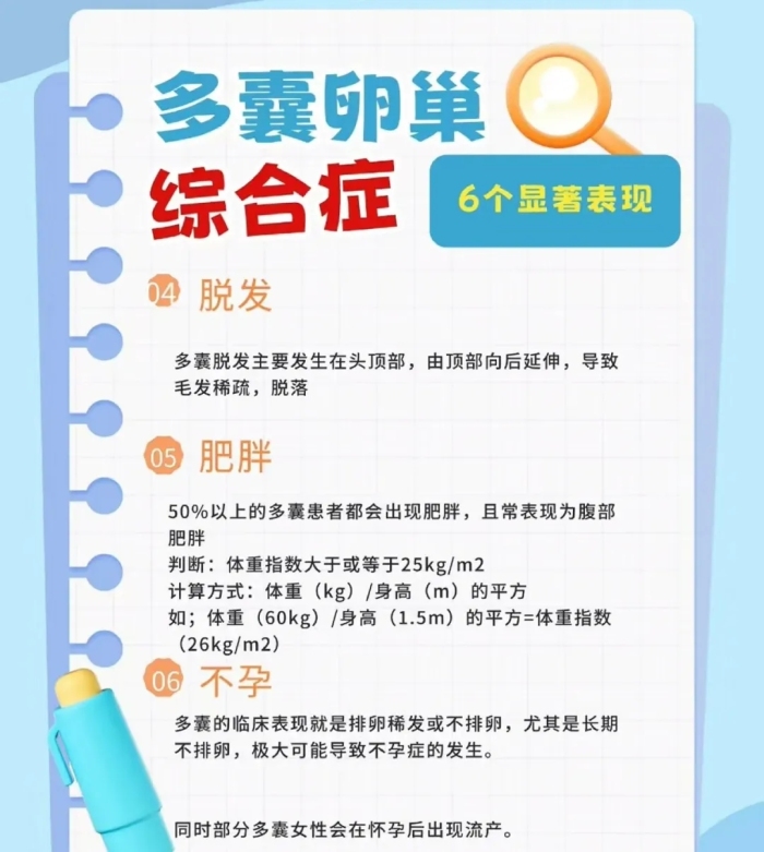 近期危害:最容易引起注意的是月经的异常,育龄期女性多表现为不孕。此外包括爱美女性关注的肥胖、痤疮、多毛等问题。
