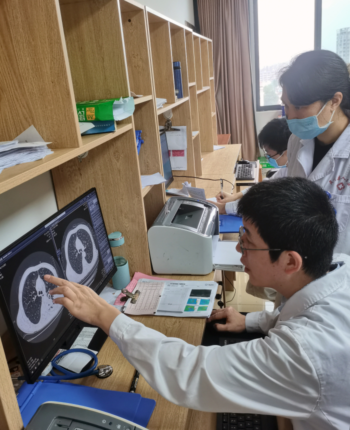 义诊活动结束后,呼吸与危重症医学科二病区主任屈东明带领医护人员来到灵川县人民医院呼吸科,组织医护查房,为当地疑难病例患者答疑解难。