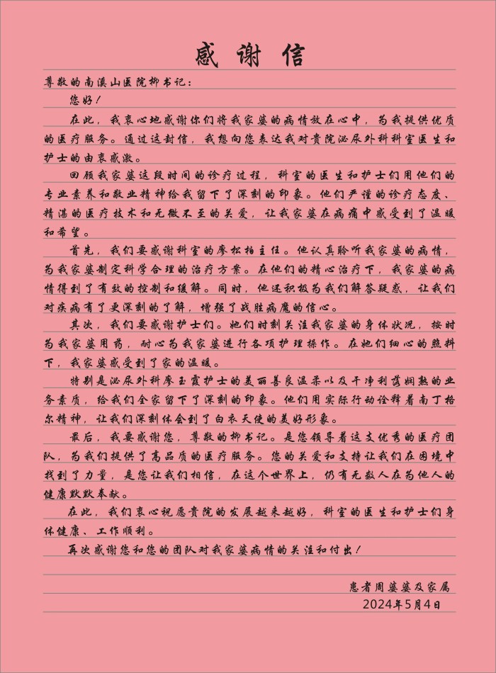 在离开医院之前,她的家人特意写了一封感谢信,表达了对南溪山医院及整个泌尿外科团队的感激之情,以下为感谢信内容: