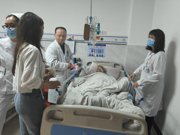 随后,陈熙教授随廖剑锋主任至病房查看肿瘤患者。平乐县中医院唐鹏程医师遇到了一例棘手患者,这是一例晚期结肠癌合并有肠梗阻的高龄患者,该患者因重度贫血无法行手术治疗,在廖剑锋主任的带领下,全院职工积极献血,为患者争取了手术治疗机会,但患者手术后的治疗方案困扰了廖主任团队。陈熙教授详阅患者病例并查看患者后认为该患者年纪大,待手术治疗身体恢复后,若患者身体情况好,可酌情给予副作用小的化疗方案治疗。