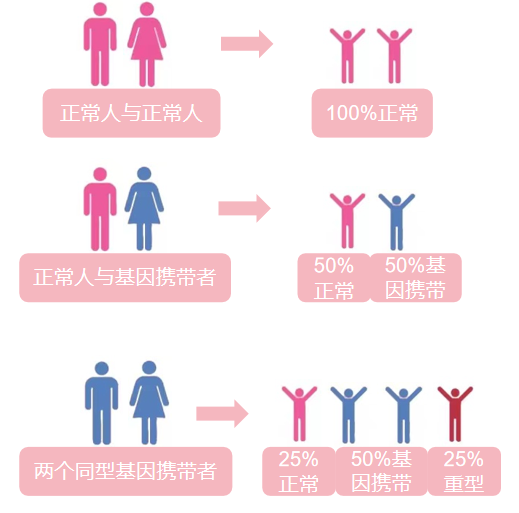 若夫妻双方仅一方是地中海贫血基因携带者,每次妊娠,他们的子女有50%的机会因遗传而成为地贫基因携带者;若夫妻双方都是同一类型的地中海贫血基因携带者,他们的子女有25%的机会正常,50%的机会成为地贫基因携带者,25%的机会成为重型地贫患者。