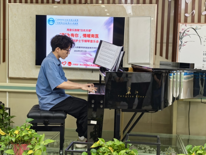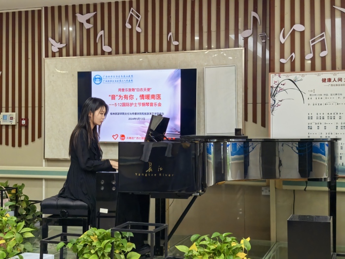 5月12日下午,广西壮族自治区南溪山医院住院部6号楼一楼琴声悠扬,余音袅袅。正值第113个国际护士节,医院团委举办了“‘音’为有你,情暖南医”主题钢琴音乐会,用音乐传递爱与希望,向辛勤工作在一线的护理人员表达敬意和节日祝福。