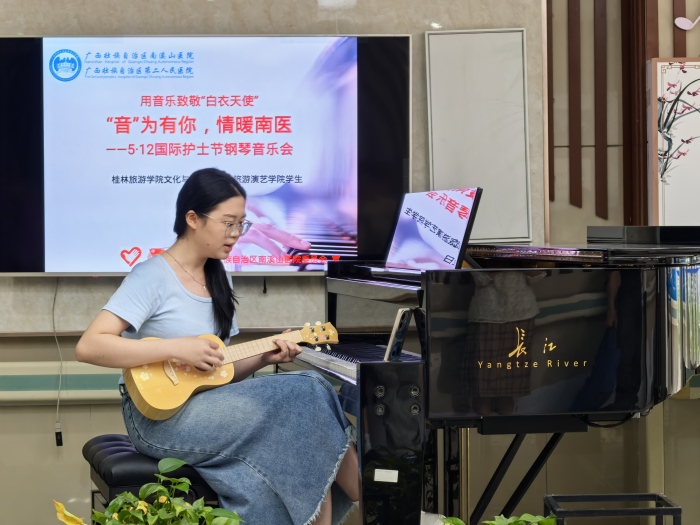 本次钢琴音乐会的志愿者是来自桂林旅游学院文化与传播学院和旅游演艺学院的学生,8名同学轮番上场,倾情演奏了一首首悠扬动听的曲目,为“白衣天使”送上最美的祝福。