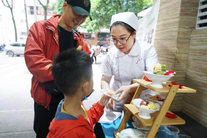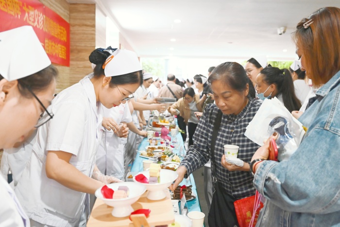 “快来看看,这是什么?好漂亮呀!”“这个药膳和养生茶真不错!”活动现场,护士们妙“手”生花般的厨艺烹制的药膳及养生茶,给市民们带来一场体现中医特色的健康美食盛宴,吸引了市民前来品尝观赏,收获了大家诸多好评。