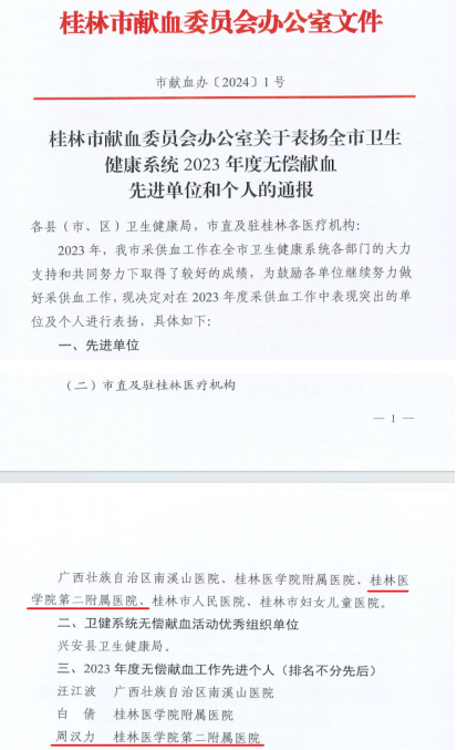 为表彰先进、树立榜样,近日,桂林市献血委员会表彰桂林市卫生健康系统2023年度无偿献血先进单位和个人。其中,桂林医学院第二附属医院获“桂林市卫生健康系统2023年度无偿献血先进单位”,心血管内科一病区周汉力副主任医师获评“2023年度无偿献血工作先进个人”。