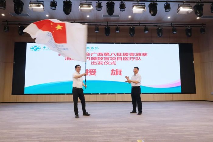 在热烈的掌声中,自治区卫生健康委对外交流合作处处长黄文新向广西第八批援柬埔寨消除白内障致盲项目医疗队队长王俊授队旗。队员们也纷纷表示,将不负重托、不辱使命,以实际行动为祖国的援外医疗事业贡献自己的力量。