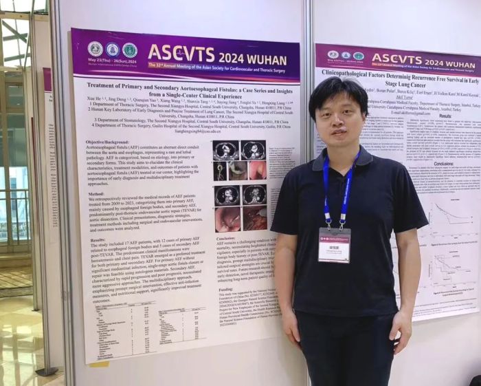 5月24-26日,第32届亚洲胸心血管外科学会年会在武汉隆重举行,中南大学湘雅二医院派驻专家、中南大学湘雅二医院桂林医院胸外科执行主任梁恒星副教授作为通讯作者的论文《单中心下主动脉食管瘘治疗经验》经过专家评审,被大会录用作壁报展示交流。