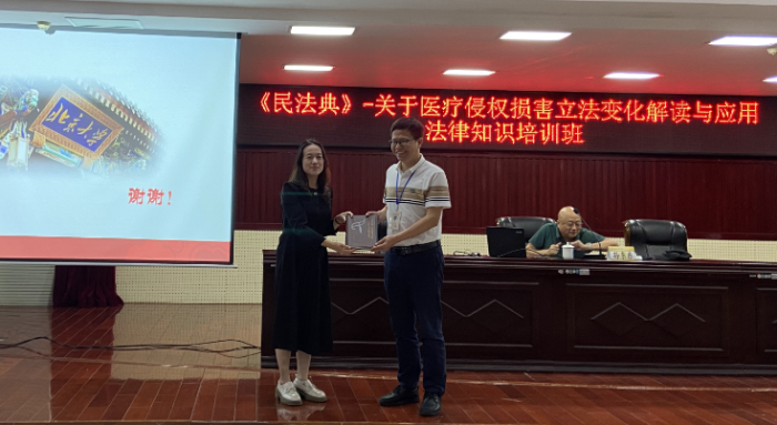 培训班邀请北京大学法学院孙东东教授担任主讲嘉宾。孙教授凭借丰富的法律知识和实践经验,详细解读了《民法典》里“第四编人格权”及“第七编侵权责任”法条法规,并结合医院日常诊疗活动中可能遇到的纠纷案例,为医务人员提供了实用的法律指导和应对策略。课程结束后,孙教授还赠送了由其亲自编撰的《〈民法典〉——关于医疗侵权损害立法变化解读与应用》和《医疗告知手册》两本书籍,为我院医务人员提供了宝贵的学习资料。