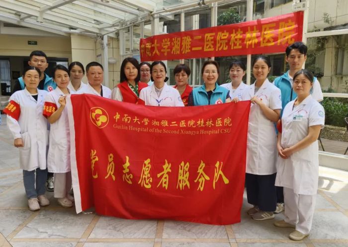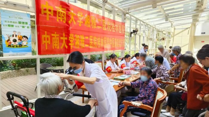在医疗志愿服务现场,中南大学湘雅二医院桂林医院五官学科党支部、中医康复党支部、健康管理中心党支部、检验学科党支部、南门社区党支部一行12人组成医疗专家团队,充分发挥各自专业特长,为前来问诊的老年居民提供眼病筛查、视力检查、慢病咨询、中医康复指导、刮痧拔罐等健康服务。