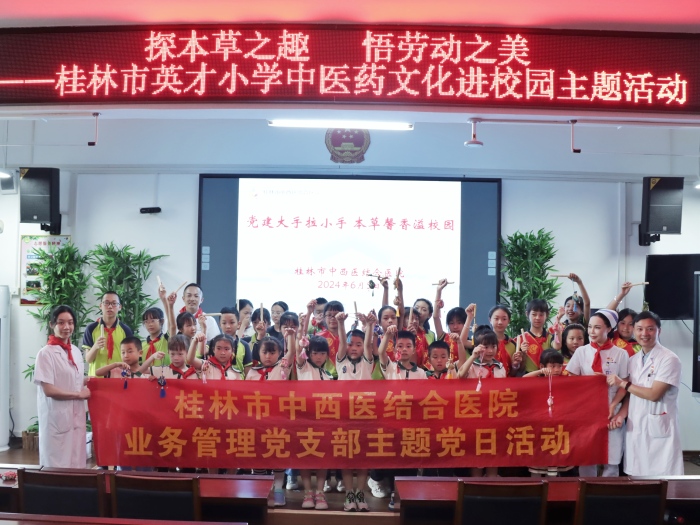 6月5日下午,桂林市中西医结合医院党支部联合民盟桂林市中西医结合医院支部在桂林市英才小学开展了“大手拉小手,本草馨香溢校园—中医药文化进校园”主题活动。此次活动旨在贯彻落实《中共中央国务院关于促进中医药传承创新发展的意见》,进一步传承和弘扬中医药文化,提升学生的中医药健康素养。