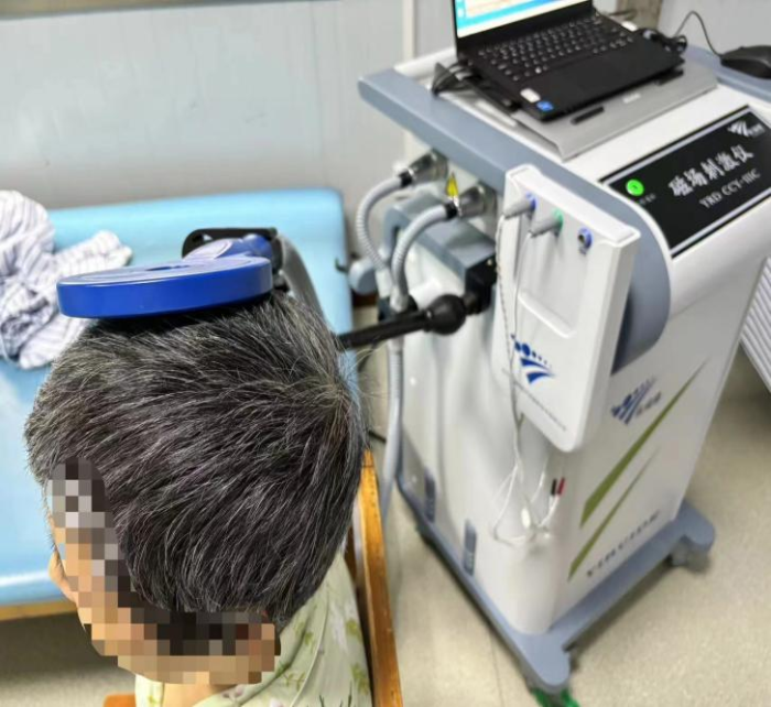 入院时,患者意识尚还清晰,但配合度稍差,并且双侧偏瘫,仍留置有胃管。康复医学科团队在评估后为患者制定了一套系统的康复治疗方案,包括吞咽功能训练、咽部电刺激、认知功能训练、重复经颅磁刺激等。