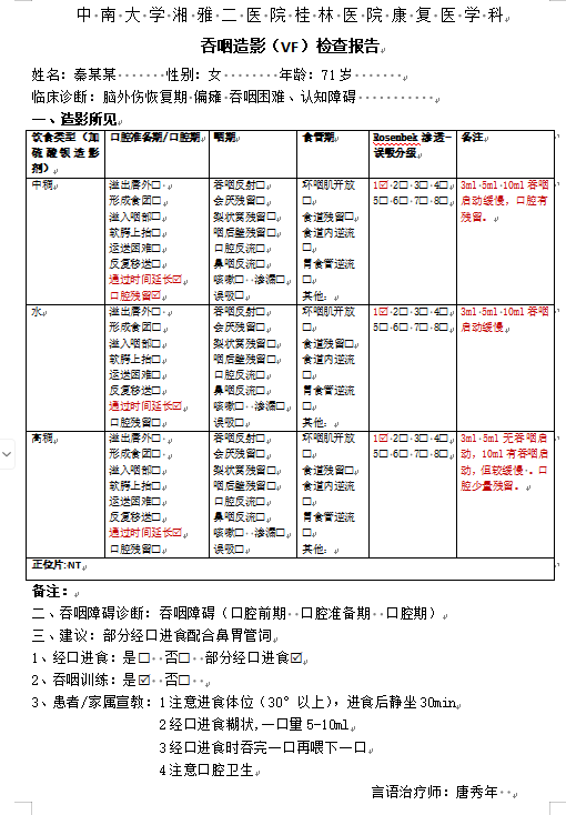 为了明确患者安全拔除胃管及恢复经口进食的可行性,从湘雅二医院康复医学科进修归来的言语吞咽治疗师唐秀年与主管医护团队进行了深入的沟通。经过综合评估,团队决定为患者进行吞咽造影检查,以确保能够准确评估其吞咽功能,为后续治疗提供科学依据。