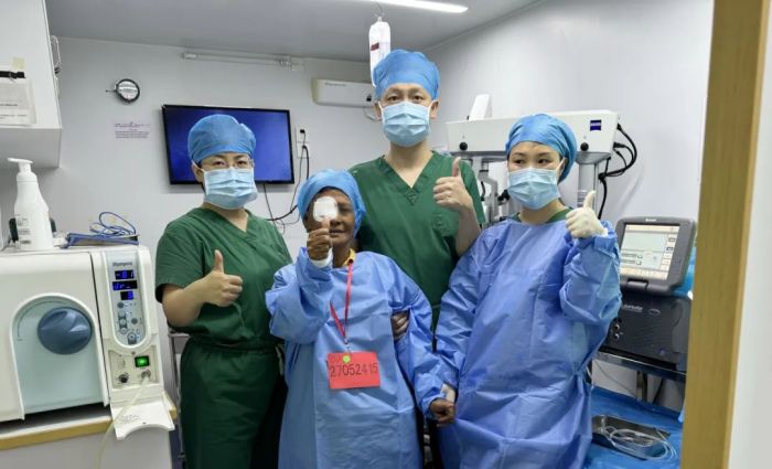 艾淘女士多年前双眼出现视力下降情况,如今已严重影响日常生活。经过医疗队的细致检查,艾淘女士被确诊为白内障,且各项指标均符合手术标准。因此在同一日,医疗队为两位好邻居实施了白内障超声乳化术及人工晶体植入术。第二天拆开眼睛上的纱布后,两位女士的视力都恢复到了1.0。这让她们喜不自胜地拥抱了医疗队员,并表达了对中国医疗队的深深感激。她们表示,中国医疗队专家的手术技术十分高超,手术过程快速且几乎无痛,为她们带来了前所未有的希望和光明。
